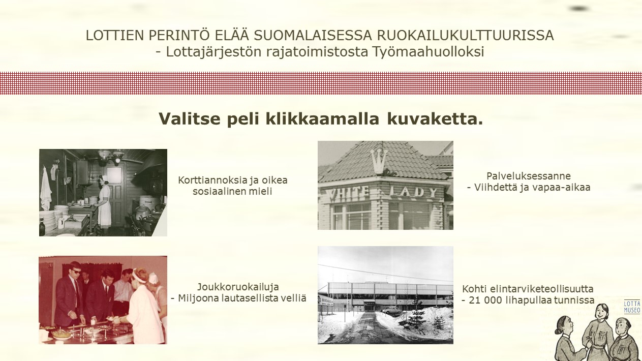 Lottamuseon uusi verkkotuotanto Lottajärjestön rajatoimistosta Työmaahuolloksihttp://www.lottamuseo.fi/tyomaahuolto-peli/ kertoo, kuinka lottaperintö on siirtynyt sukupolvelta toiselle, vaikka itse järjestö lakkautettiinkin välirauhansopimuksen nojalla syksyllä 1944. Moniko meistä tulee ajatelleeksi lounastaessaan Amican ruokalassa, että Amica on kehittynyt lottien 1940-luvulla perustamasta Työmaahuollosta.