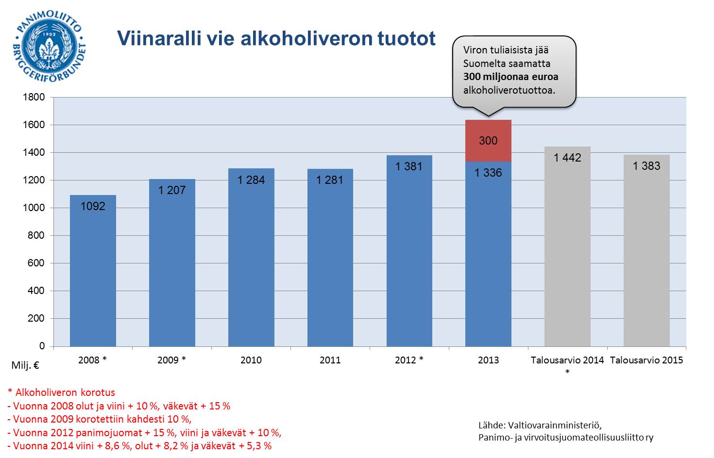 Kotimainen panimoteollisuus tuottaa vuosittain 1,3 miljardia euroa verotuloja Suomen valtiolle. Yksistään työpaikat tuottavat valtiolle 350 miljoonaa euroa vuodessa.